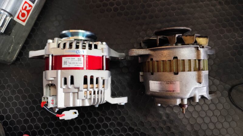 コンプレッサをモーターで駆動するインバーター制御にが入り起動時は60Aくらい負荷が掛かることがありますので、オルタネータ発電容量は80A~100Aくらいないと不安なので今回は130Aの低抵抗タイプをチョイスします。